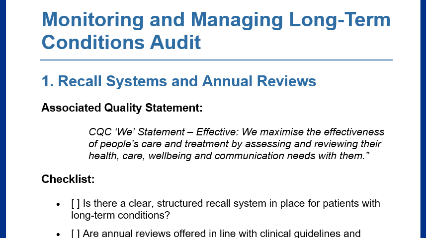 To help, we’ve created a Monitoring and Managing Long-Term Conditions Audit — a practical, CQC-aligned tool to assess what’s working well and where improvements can be made.