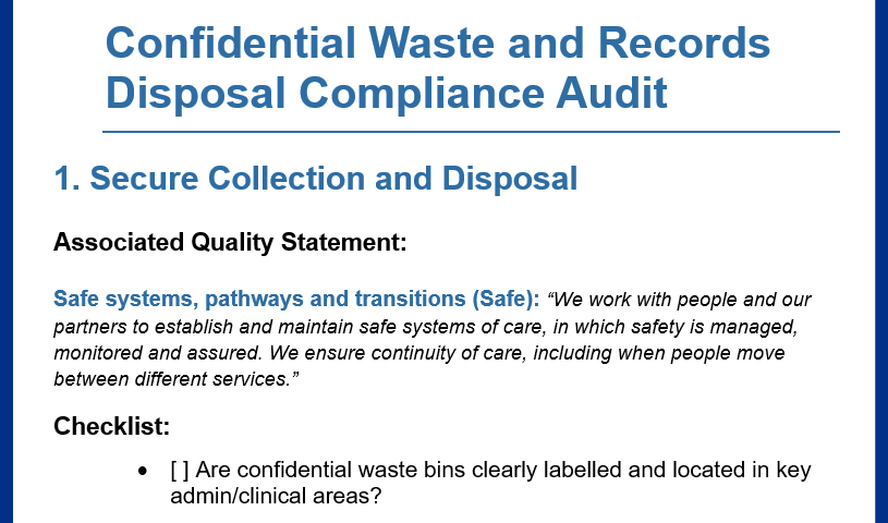 This audit helps ensure your systems for handling and destroying confidential waste are safe, robust, and inspection-ready — protecting patient trust and upholding regulatory standards.