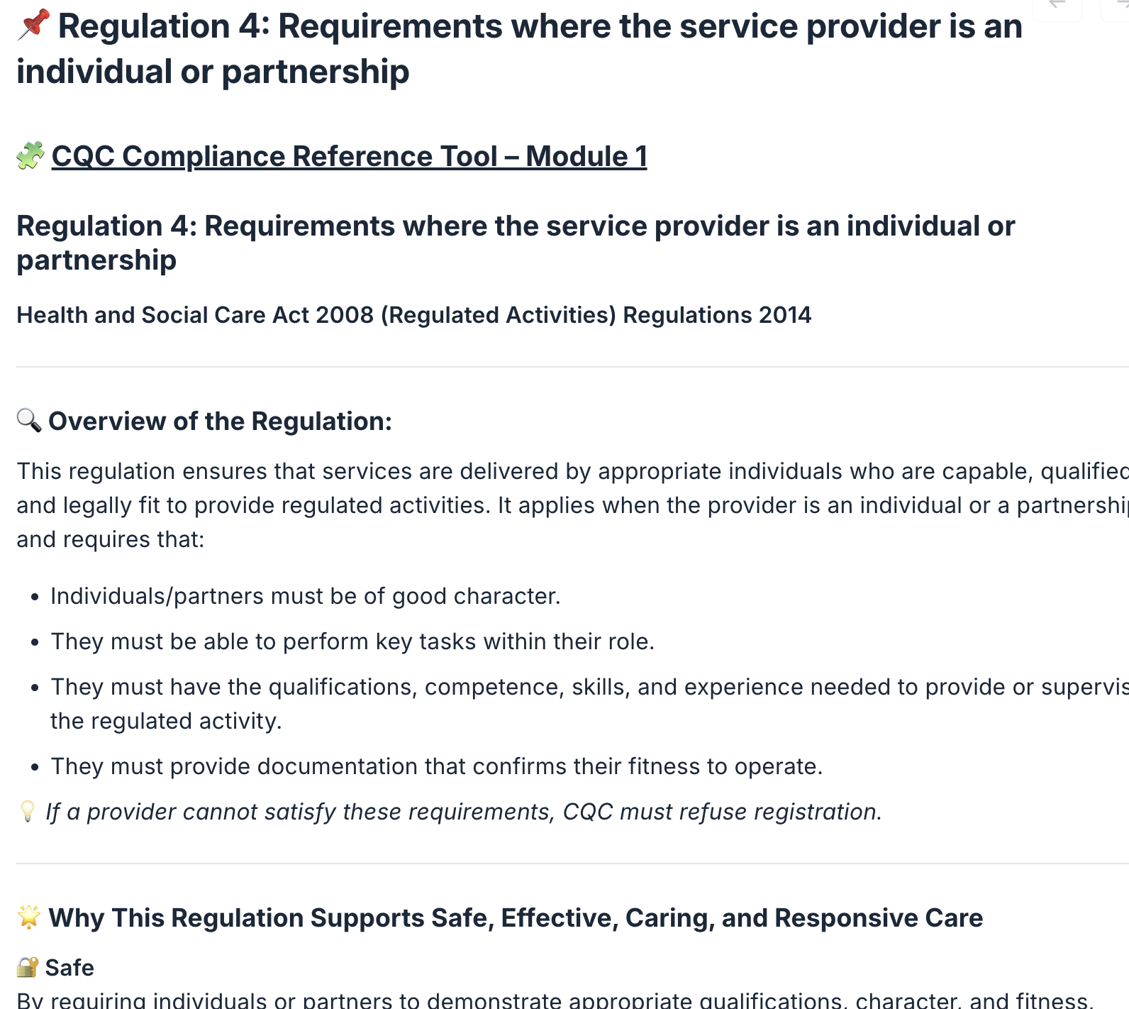 Regulation modules broken down into a summary and why this Regulation supports Safe, Effective, Caring, and Responsive Care: